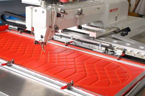 Large field CNC programmable upholstery sewing machine with 1000x400mm sewing area and highest quality sewing for the custom car seat covers and automotive Interiors (door panels, consoles, dashboards). Excessive or insufficient pressing by the stepping foot can be prevented, enabling a finish with uniform thread tightening.